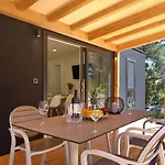 Einige der 38 klimatisierten Zimmer im Hotel Pine Beach Pakostane Glamping Homes haben Blick auf den Garten und verfügen über einen Patio und eine Küche. Außerdem sind sie mit Parkettbodenbelag ausgestattet.